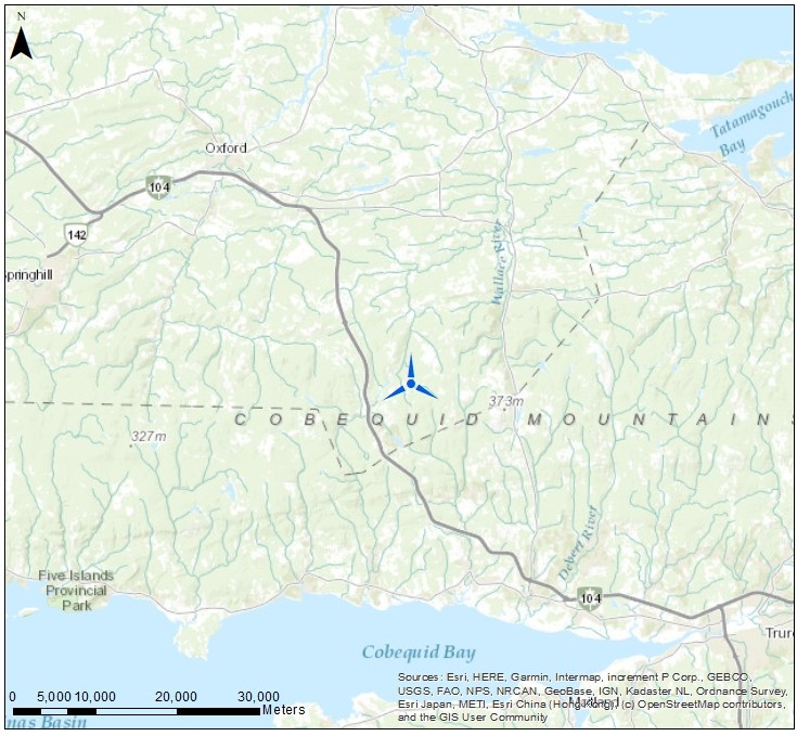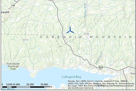 The Blueberry Acres Wind Energy Project is a proposed renewable energy facility with a total capacity of up to 61.2 MW. The project will be comprised of up to nine turbines with a nameplate capacity between 5.9 to 7.2 MW. The facility would be located on privately‐held land in the south east of Cumberland county, near highway 104. The project is being developed through a partnership including one or more First Nation communities that are yet to be disclosed, and SWEB Development LP (SWEB Energy), a Halifaxbased renewable energy developer and operator.